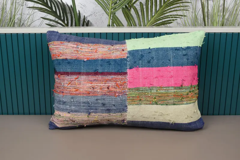 Almohada de tiro patchwork azul y naranja, almohada rectangular hecha a mano de 16x24