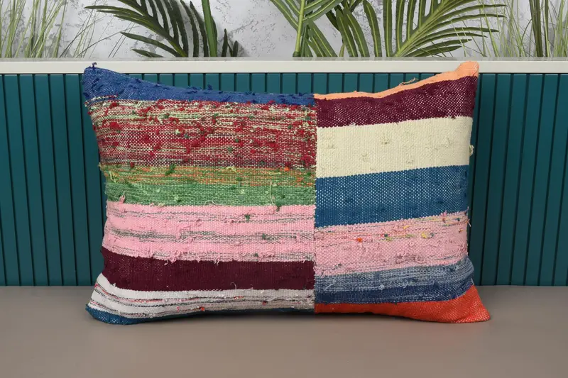 Almohada de tiro patchwork azul y rosa, cojín bordado 16x24
