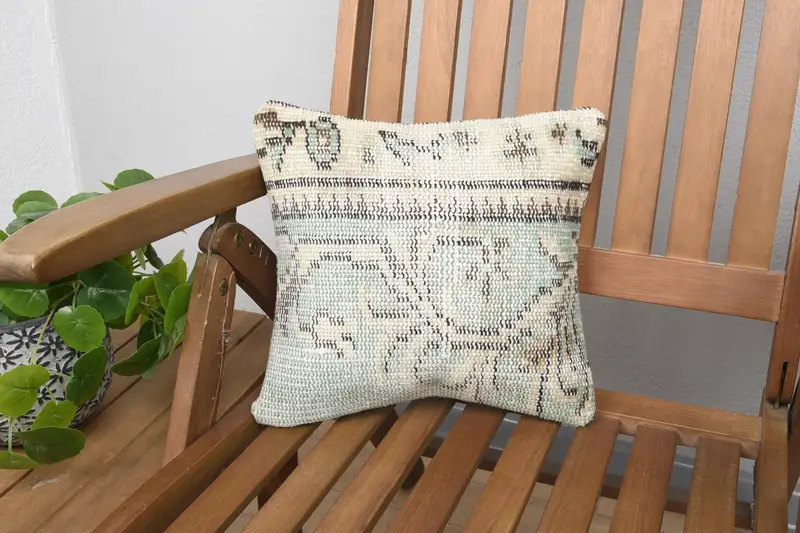Almohada de tiro bordada geométrica verde y beige, cojín vintage hecho a mano