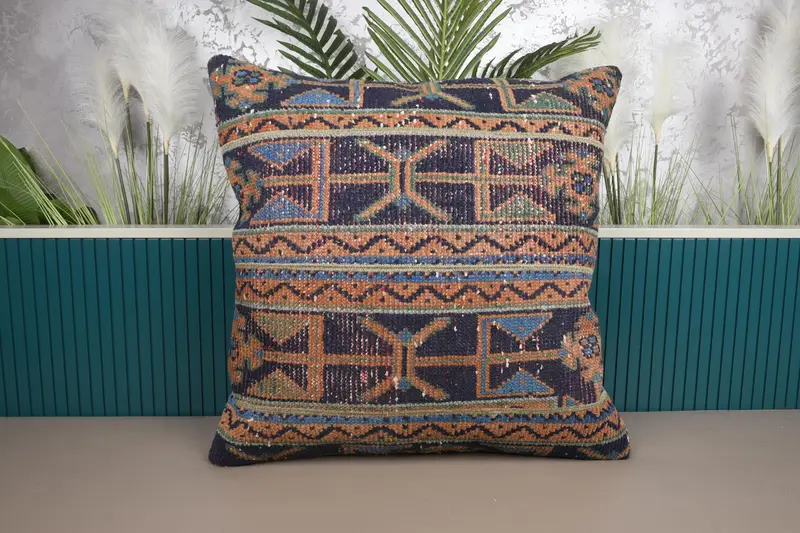Almohada de tiro patchwork azul y naranja, cojín bordado 28x28