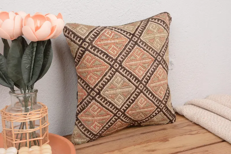 Almohada de lanzamiento geométrico marrón y beige, cojín bordado vintage