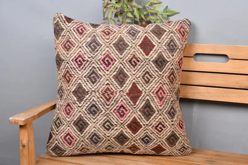 Almohada de tiro bordada beige y marrón, cojín vintage 24x24
