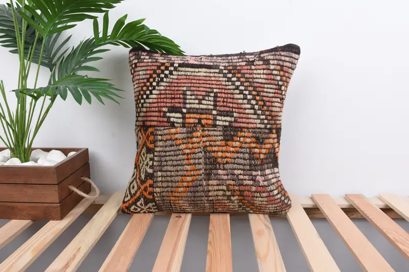 Almohada de tiro patchwork naranja y marrón, cojín vintage 16x16