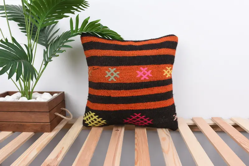 Almohada de tiro a rayas naranja y marrón, cojín bordado 16x16