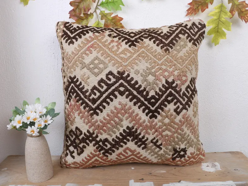 Almohada de lanzamiento geométrico marrón y beige, cojín bordado vintage