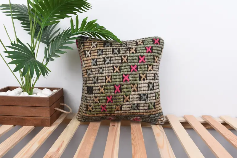 Almohada de tiro bordada geométrica verde y naranja, cojín vintage hecho a mano