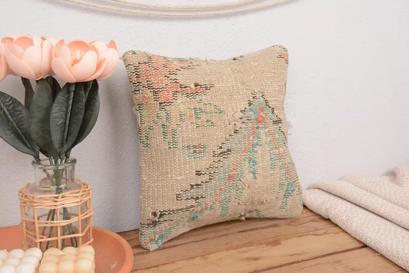 Almohada de lanzamiento bordada floral beige y roja, cojín vintage hecho a mano