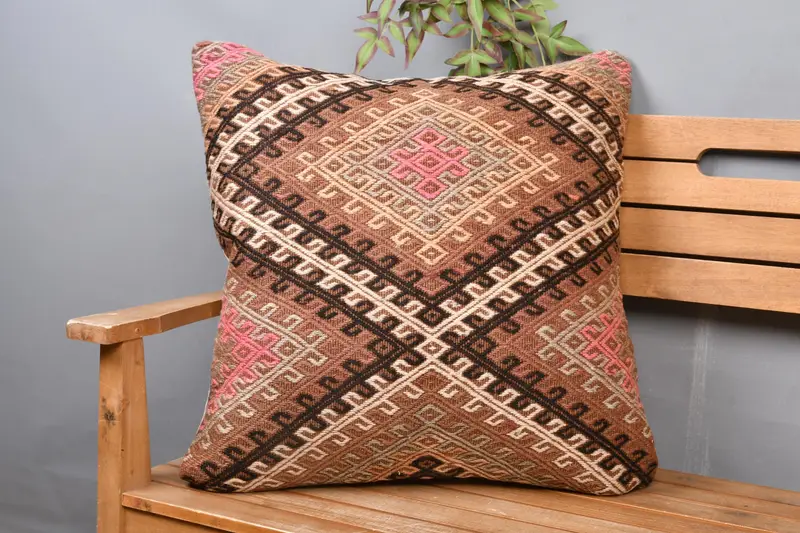 Almohada geométrica de lino marrón y beige, cojín bordado vintage