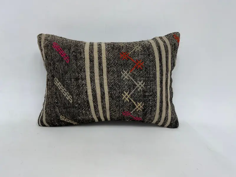Almohada de tiro a rayas marrón y beige hecha a mano, almohada rectangular vintage de 16x24