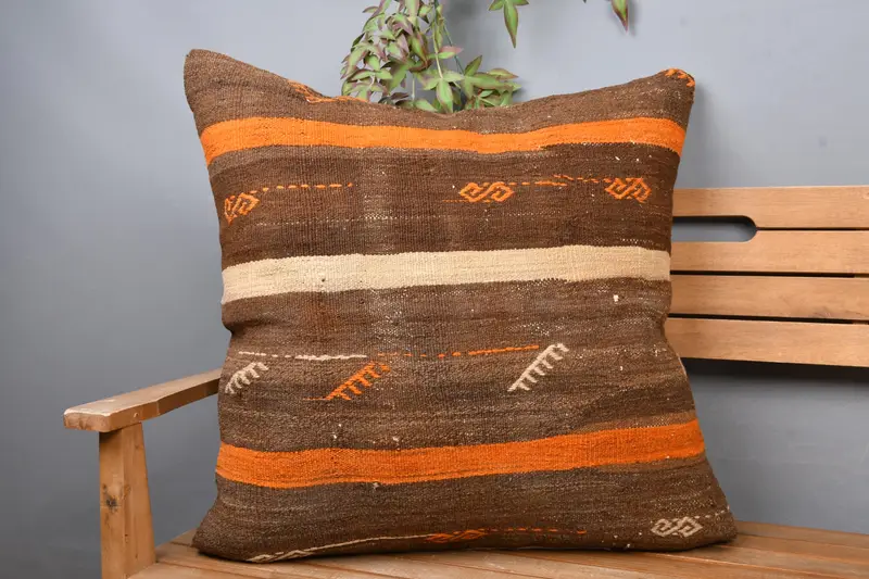 Almohada de tiro a rayas marrón y naranja hecha a mano, cojín bordado vintage