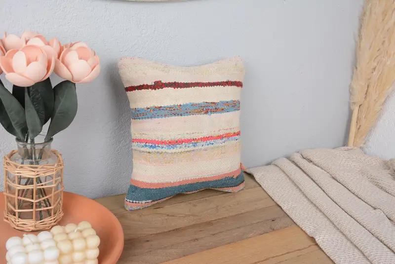 Almohada de tiro a rayas beige y bronce, cojín bordado vintage