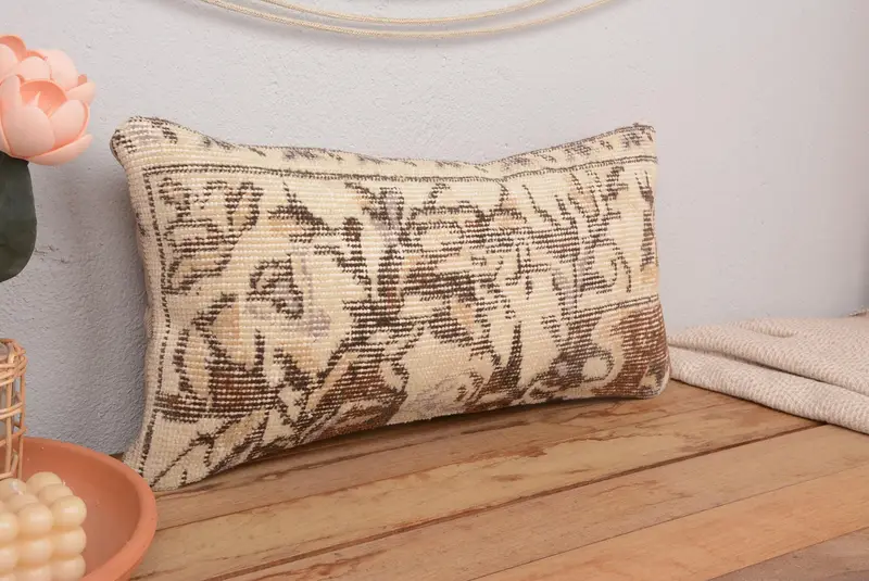 Almohada bordada beige y marrón, almohada de lanzamiento hecha a mano 12x24