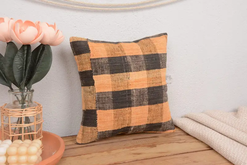 Almohada de tiro a rayas naranja y marrón, cojín bordado vintage