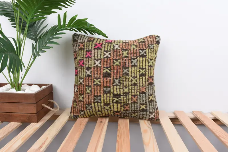 Almohada de tiro bordada verde y naranja, cojín de lino hecho a mano