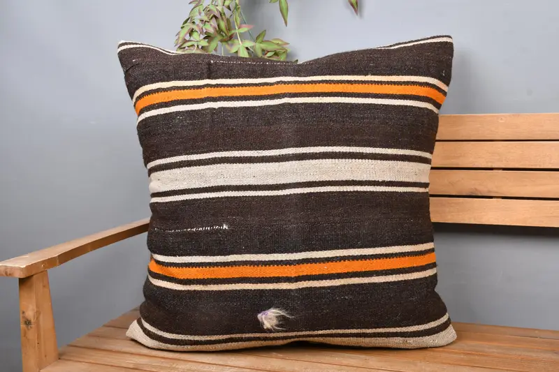 Almohada de tiro de lino a rayas marrón y beige, cojín bordado vintage