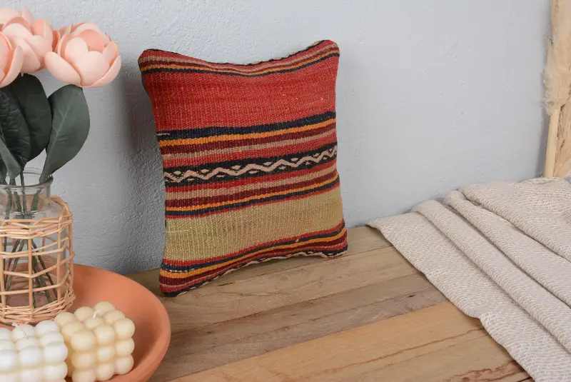 Almohada de tiro de rayas rojas y naranjas bordadas, cojín de lino vintage 12x12