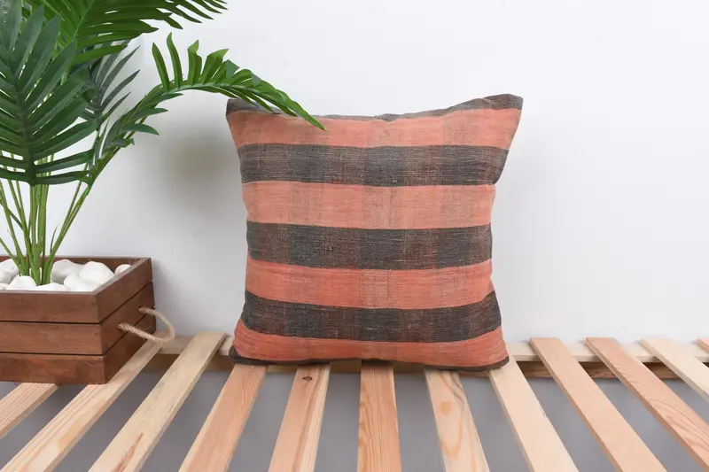 Almohada de tiro a rayas rosa y marrón, almohada bordada vintage