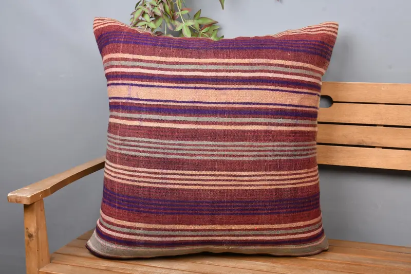Almohada de tiro a rayas marrón y bronce, cojín bordado vintage