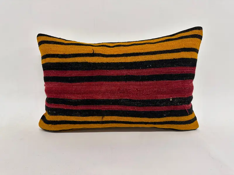 Almohada de tiro a rayas marrón y roja hecha a mano, cojín de lino vintage 16x24