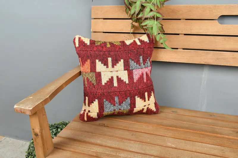 Almohada de lanzamiento Kilim rojo, cojín bordado 14x14 con encanto vintage
