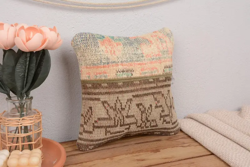 Almohada de lanzamiento de patchwork bordado beige y marrón, cojín vintage hecho a mano