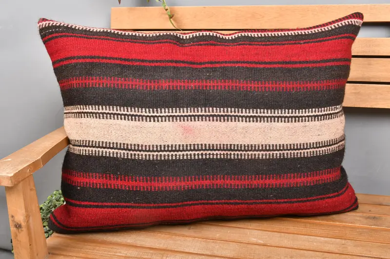 Almohada de tiro de rayas beige y roja, almohada rectangular bordada vintage