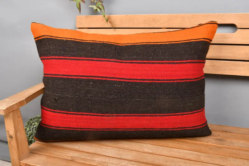 Almohada de tiro a rayas rojas y marrones, cojín de lino hecho a mano