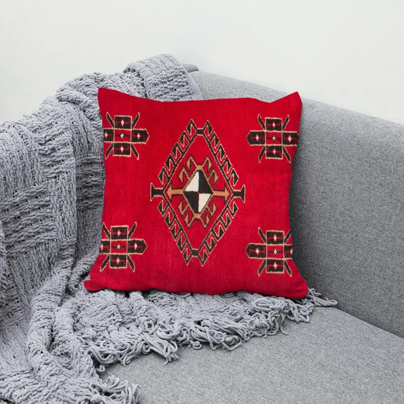 Almohada de tiro bordada roja y marrón, cojín Chenille vintage