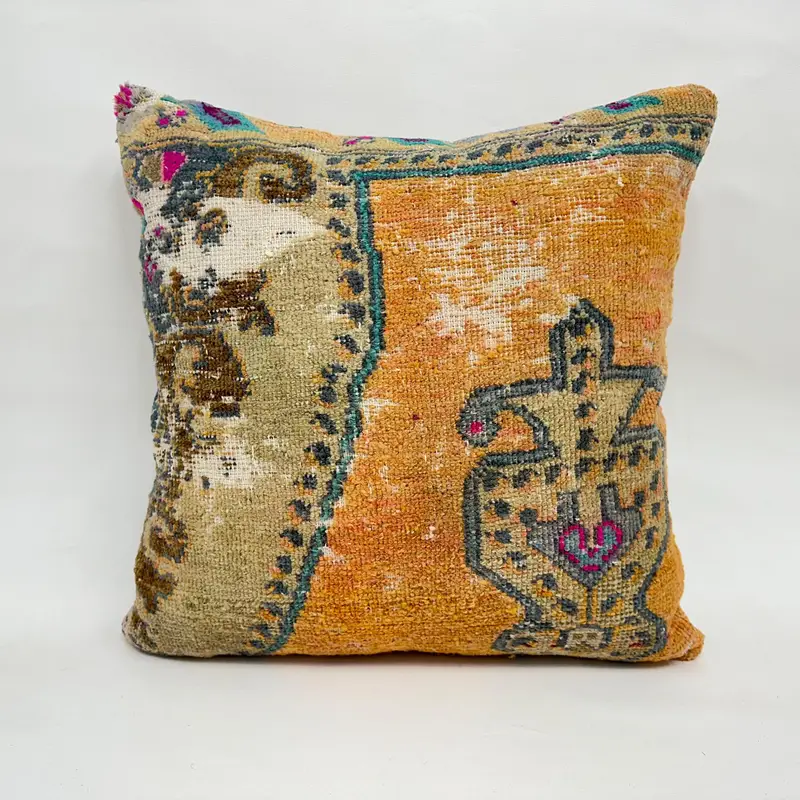 Almohada de tiro bordada floral naranja y marrón, almohada de lino vintage hecha a mano