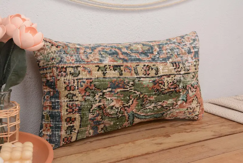 Almohada de tiro floral verde y bronce hecha a mano, cojín versátil de 12x24