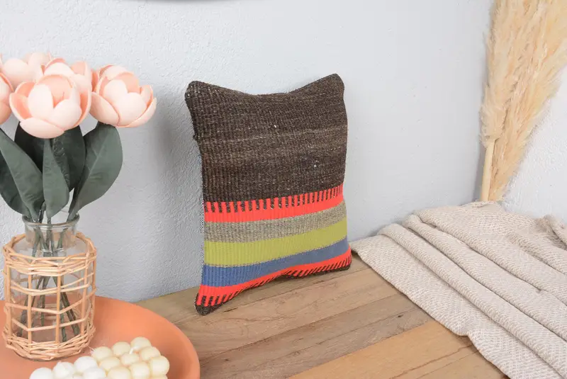 Almohada de tiro de rayas marrones y verdes, cojín bordado vintage