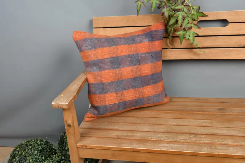 Almohada de tiro a rayas naranja y gris, almohada bordada vintage