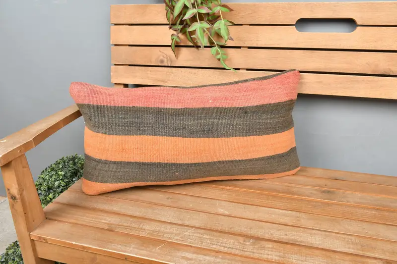 Almohada de tiro a rayas naranja y marrón, cojín vintage hecho a mano