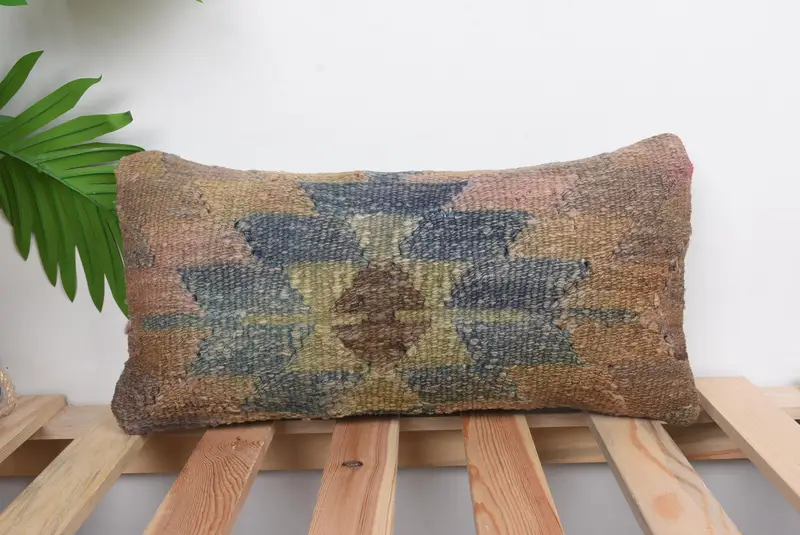 Almohada de lanzamiento geométrico azul y marrón, cojín bordado vintage