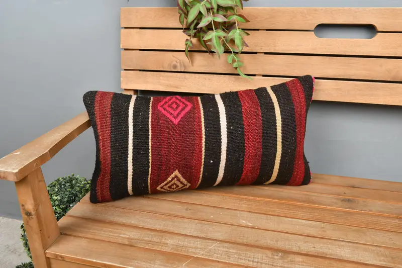 Almohada de tiro de lino geométrico rojo y marrón, almohada rectangular bordada vintage
