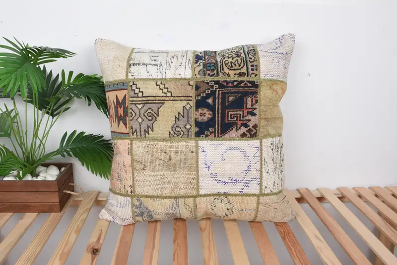 Almohada de lanzamiento de patchwork beige y verde, cojín bordado vintage