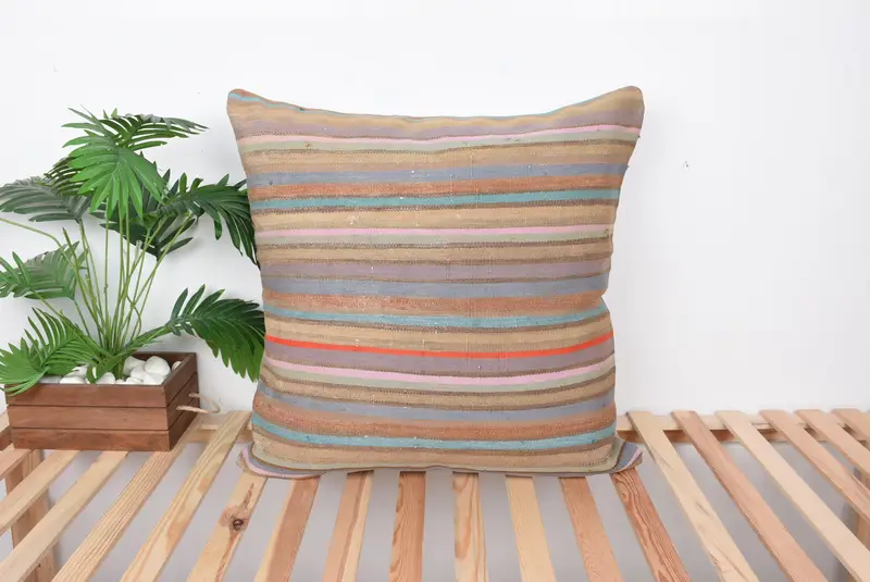 Almohada de tiro bordada hecha a mano, cojín de rayas vintage con cierre de cremallera