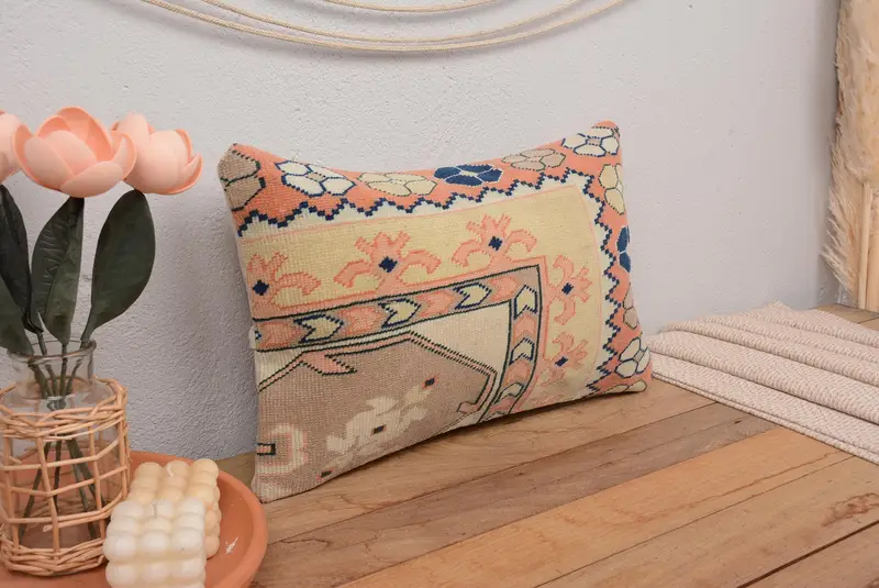Almohada de lanzamiento floral naranja y beige hecha a mano, cojín de lino bordado