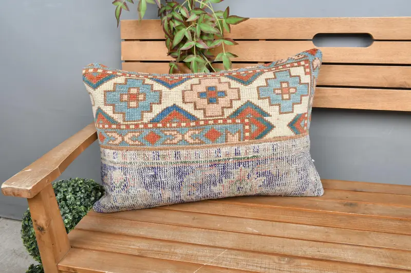 Almohada de lanzamiento geométrico azul y beige, cojín de lino y lana hecho a mano