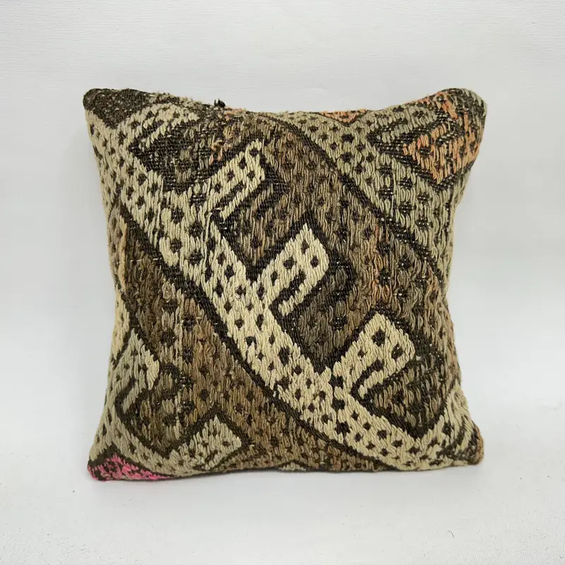 Auténtica almohada bordada marrón y beige, almohada de lanzamiento vintage