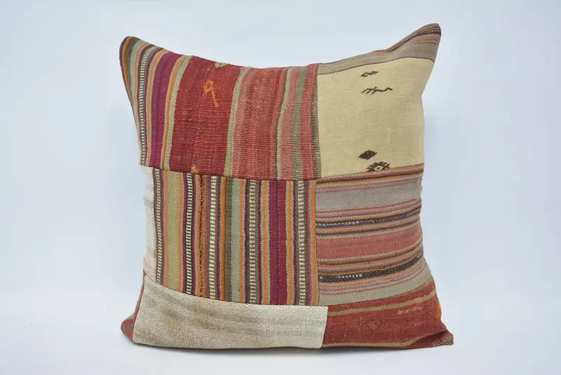 Almohada de tiro a rayas rojas y beige, cojín bordado vintage