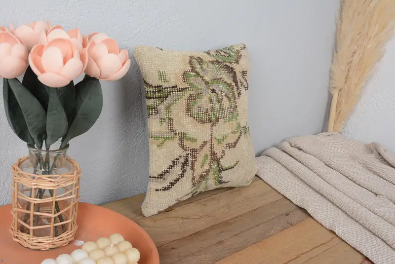 Almohada de tiro bordada beige y verde, almohada versátil de 12x12
