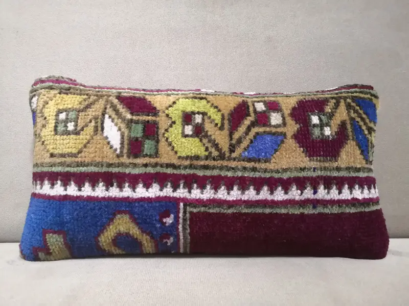 Almohada de lanzamiento de lana hecha a mano, decoración vintage geométrica azul y púrpura