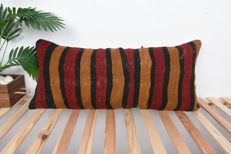Almohada de tiro a rayas rojas y marrones, cojín bordado de 16x36