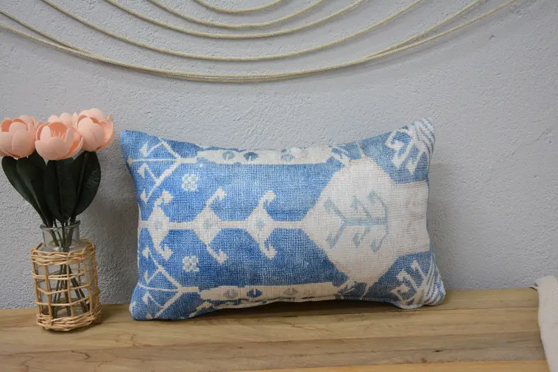 Almohada de tiro Ikat azul, cojín cuadrado vintage con cierre de cremallera