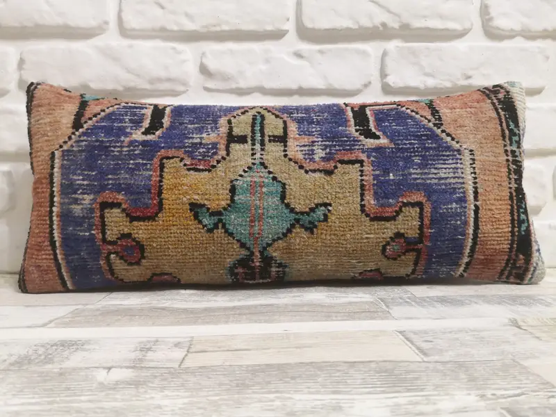 Almohada de lanzamiento rectangular azul y naranja hecha a mano, almohada de lana vintage
