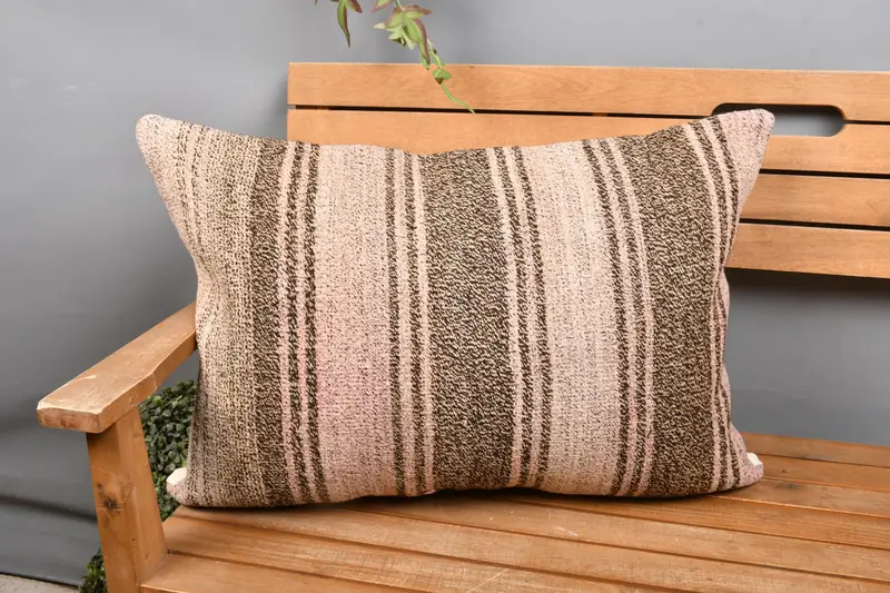 Almohada de tiro a rayas beige y marrón, cojín bordado hecho a mano
