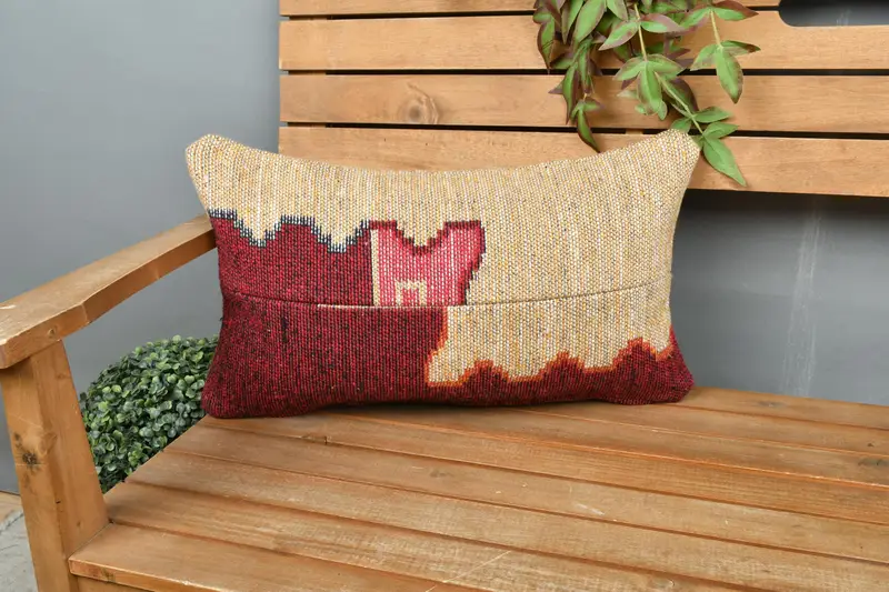 Almohada de lanzamiento beige del suroeste con detalles rojos, almohada rectangular hecha a mano