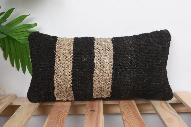 Almohada de tiro a rayas marrón y beige, almohada bordada vintage