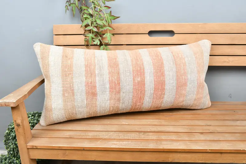 Almohada de rayas beige y naranja bordada, almohada de lanzamiento rectangular hecha a mano